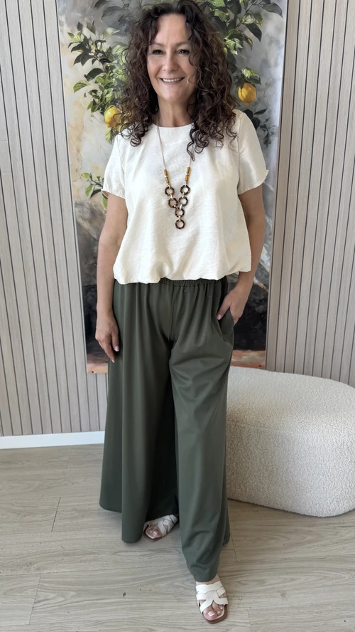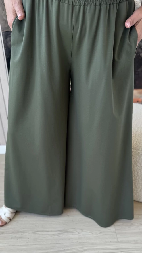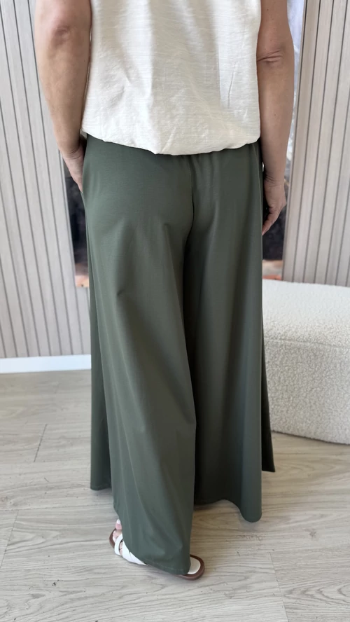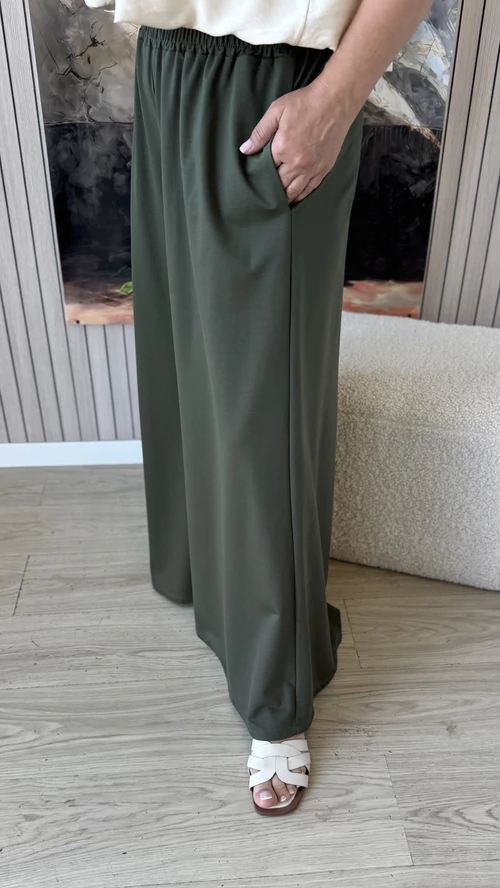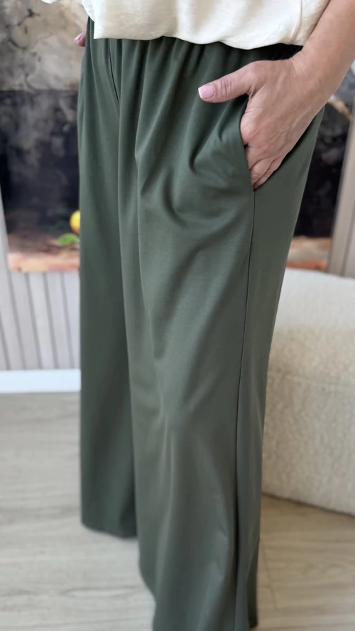 Ez az extra bő szárú nadrág ideális választás a tavaszi és nyári napokra. Lenge, könnyű anyagból készült, amely kellemes viseletet biztosít egész napra. A bővebb fazon és a gumis derék kényelmes illeszkedést garantál, miközben szabad mozgást tesz lehetővé. Tökéletes darab, ha szereted a laza, légies ruházatot egy kényelmes és stílusos megjelenéssel.