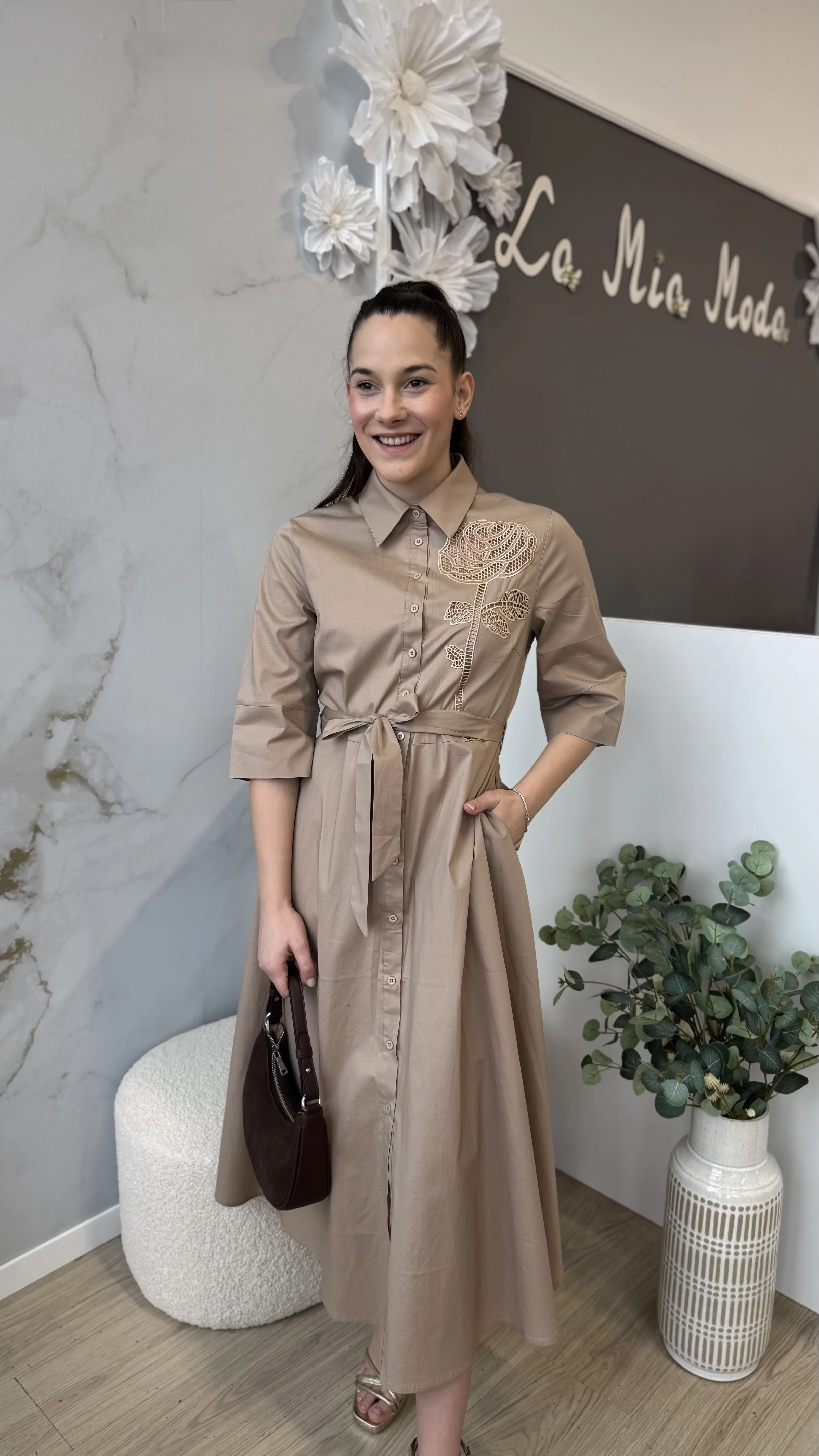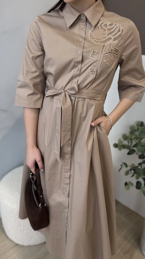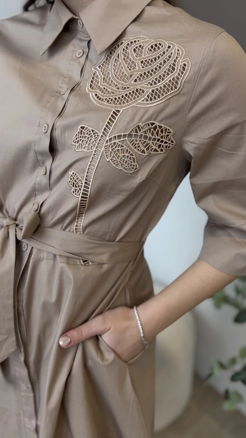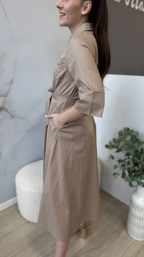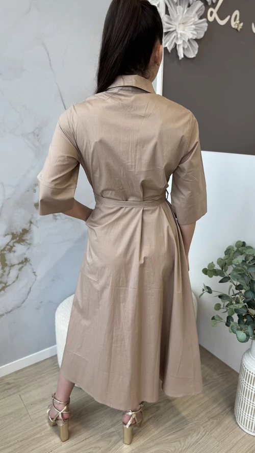 Ez a barna színű, elegáns midi ruha tökéletes választás különleges alkalmakra és hétköznapi viseletre egyaránt. A ruha galléros kialakítása kifinomult megjelenést biztosít, míg a deréknál megkötős rész lehetővé teszi az egyéni szabást és kiemeli az alakot. Kényelmes, mégis stílusos darab, amely könnyedén kombinálható különböző kiegészítőkkel. Válassza ezt a midi ruhát, ha egy időtlen és elegáns megjelenésre vágyik!