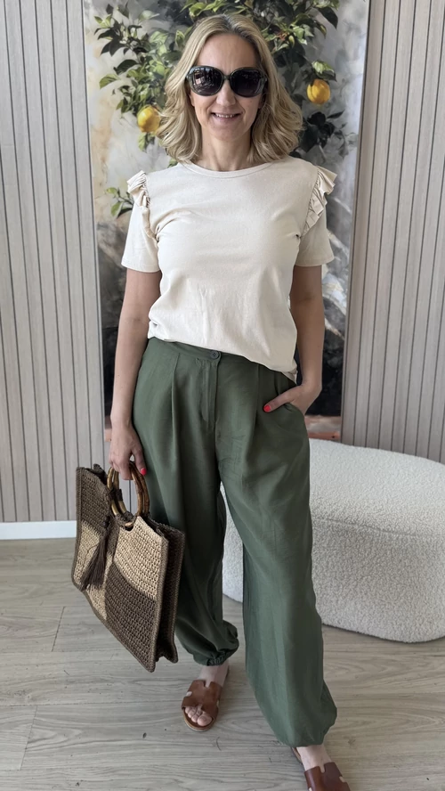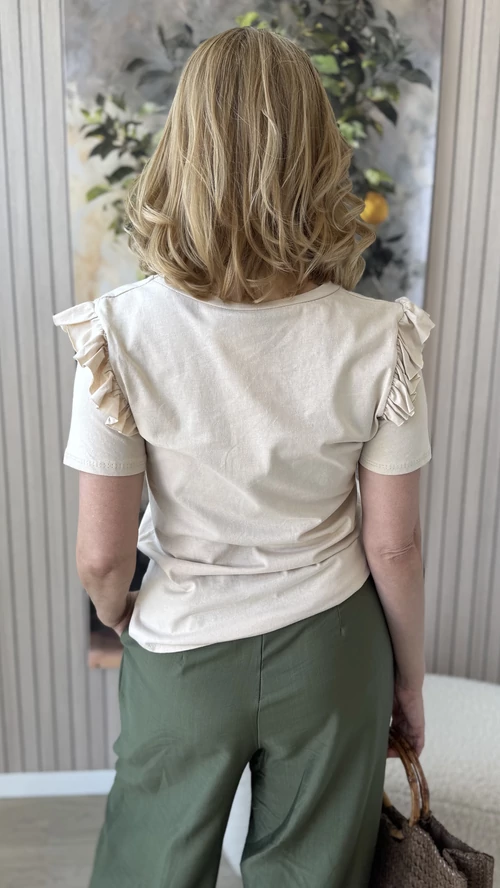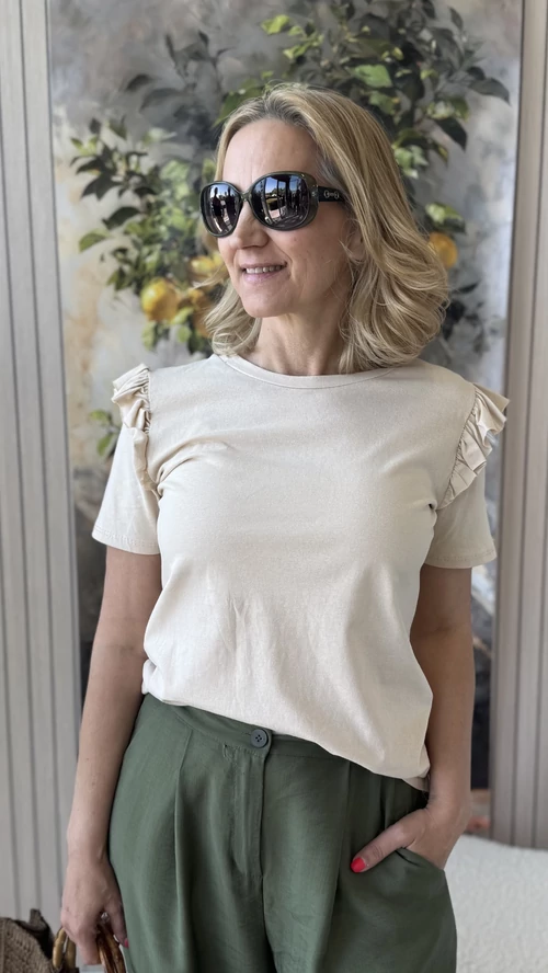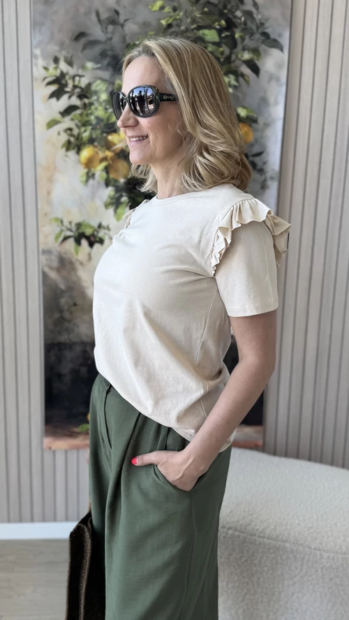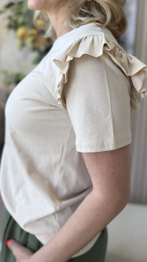 Elegáns és nőies megjelenést kínál ez a kicsit passzosabb fazonú, bézs színű felső, amely tökéletesen követi az alak vonalait. A vállrésznél található apró fodrok különleges díszítő elemként emelik ki a darabot, így egyedi és stílusos megjelenést biztosítanak. Kényelmes viselet mindennapokra, amely könnyedén kombinálható különféle ruházati darabokkal. Ideális választás azoknak, akik kedvelik a finoman részletezett, mégis visszafogott ruhákat.
