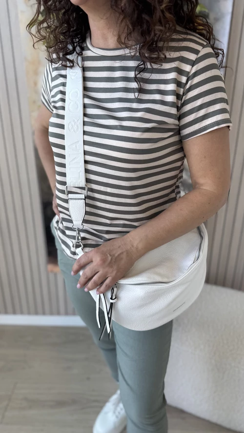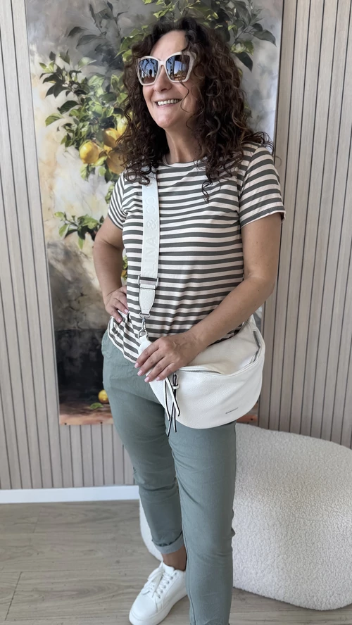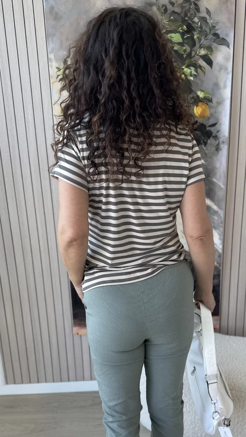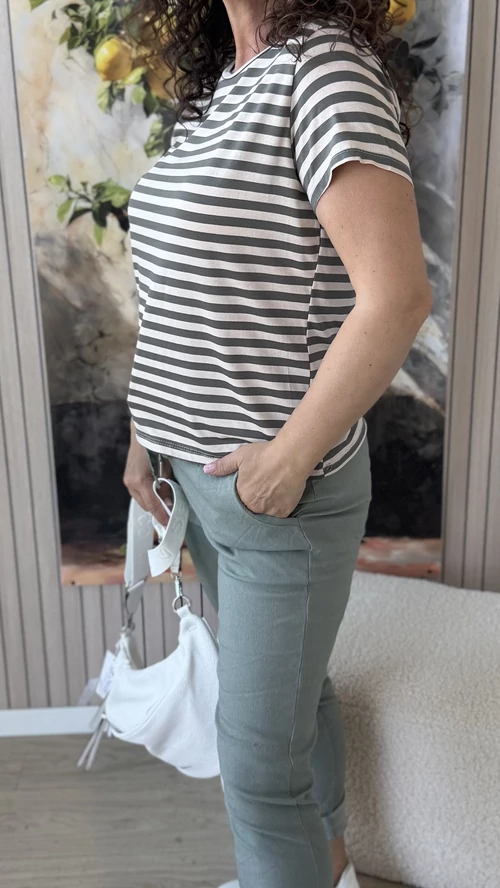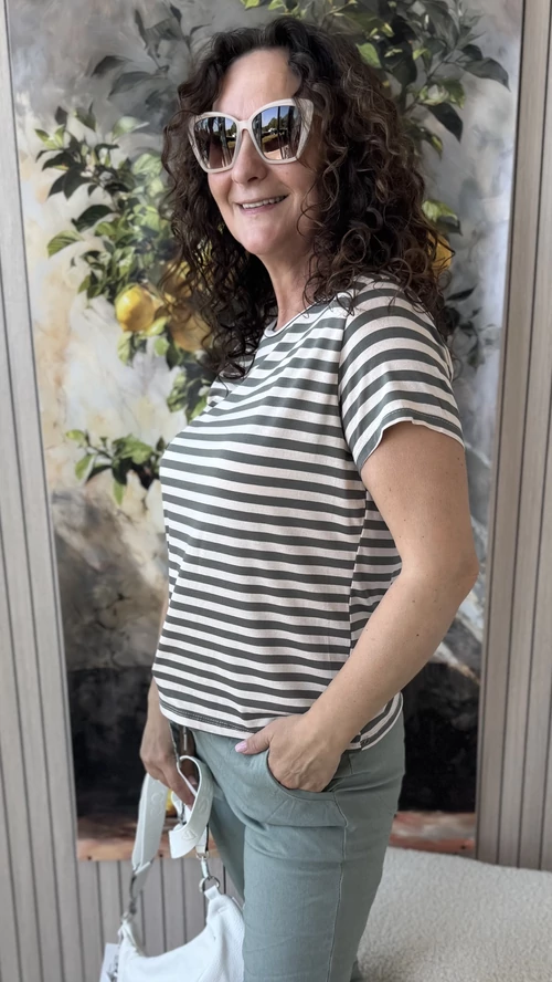 Ez a kényelmes, keki és bézs színű csíkos felső tökéletes választás a mindennapokra. Kerek nyakkivágásának és rövid ujjainak köszönhetően könnyed, szellős viseletet biztosít. A lágy esésű, puha anyag kellemes érzést nyújt a bőrnek, így egész nap kényelmes marad viselése. Stílusos és praktikus darab, amely jól kombinálható különböző ruhákkal, legyen szó hétköznapi vagy alkalmi megjelenésről.