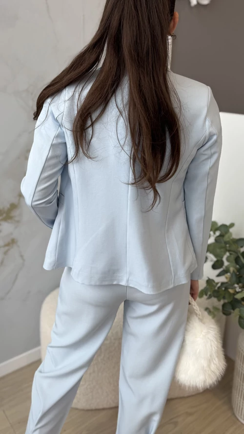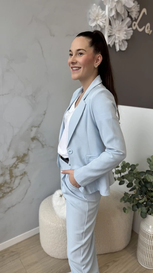 Ez a világoskék színű, elöl gombos blézer tökéletesen illeszkedik, kiemelve a nőies vonalakat. Kiváló minőségű anyagból készült, kényelmes viseletet biztosít egész napra. Alkalmas irodai megjelenéshez vagy elegáns hétköznapi outfitekhez, stílusos és időtálló darab.