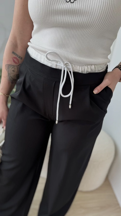 Ez a fekete, bő szárú nadrág igazán különleges darab a gardróbodban. Derék résznél található fehér extra anyag és praktikus húzózsinór teszi vagánnyá és extrává a megjelenést. Egyedi stílusával könnyen kombinálható akár hétköznapi viselethez, akár különleges eseményekhez. Kényelmes, mégis elegáns választás, amely minden alkalomra ideális.