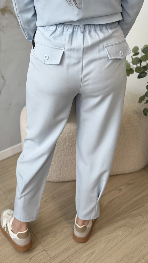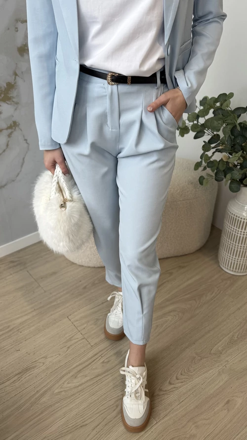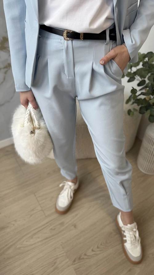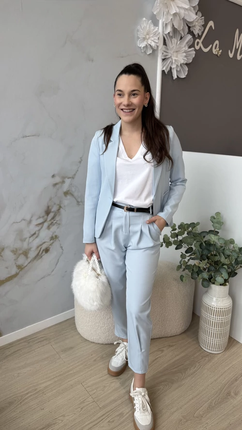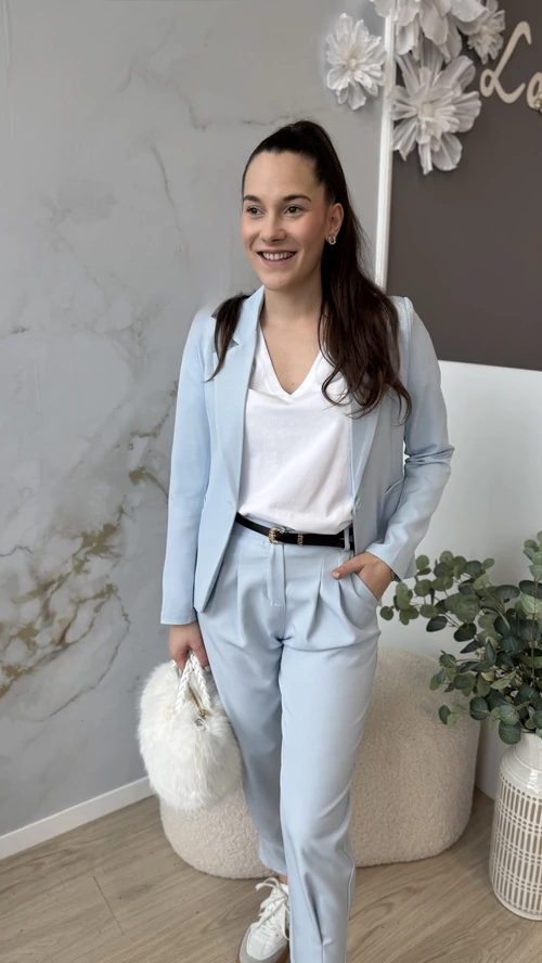 Ez a világoskék Kitti nadrág letisztult, modern stílust kínál. A nadrág saját övvel rendelkezik, amely segítségével könnyedén a derékra szabható a megfelelő illeszkedés érdekében. Szűkebb fazonú kialakítása kiemeli az alakot, miközben kényelmes viseletet biztosít egész napra. Ideális választás változatos alkalmakra, legyen szó hétköznapi vagy elegánsabb megjelenésről.
