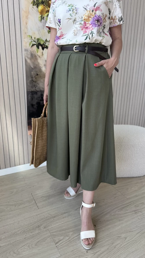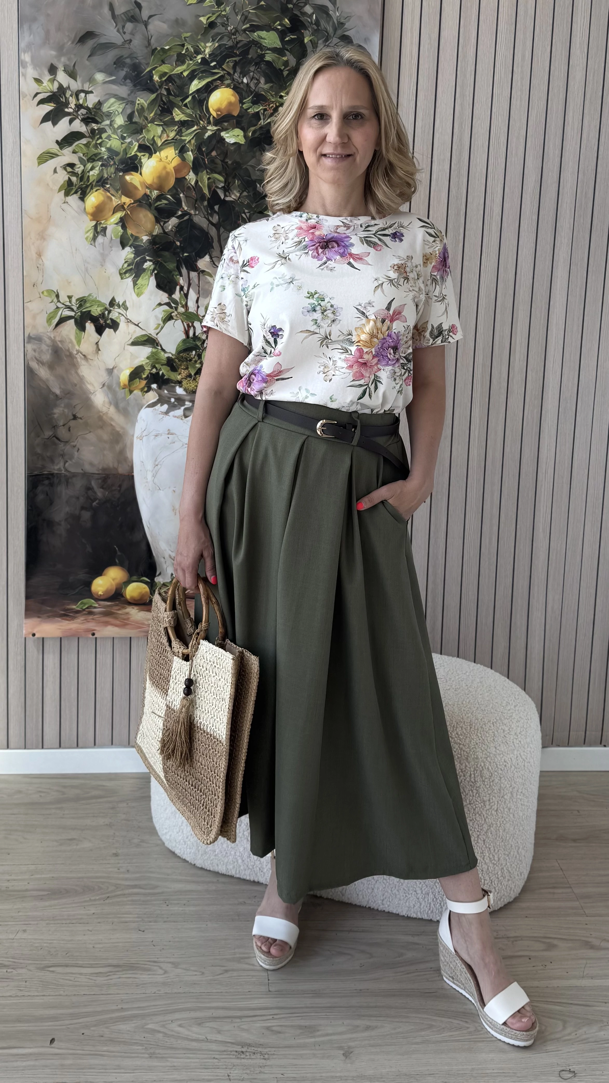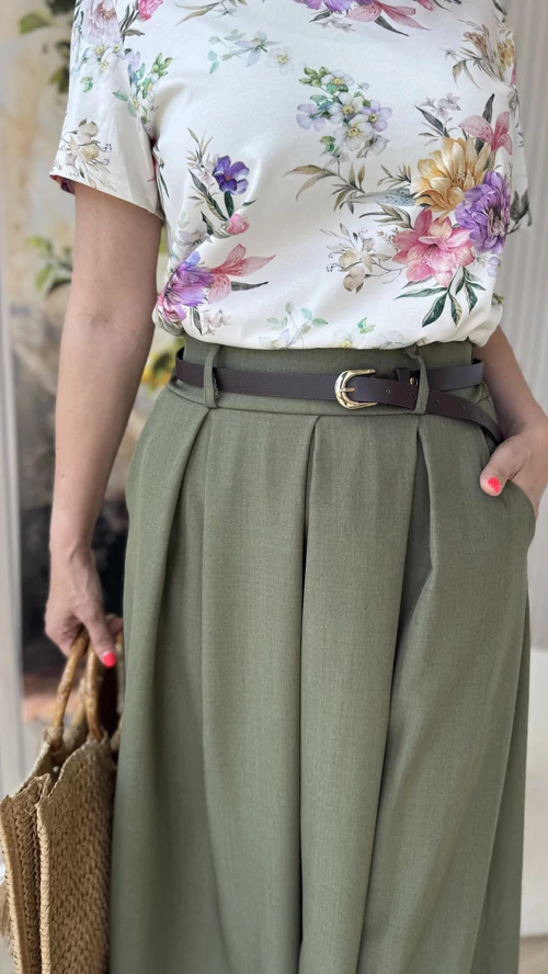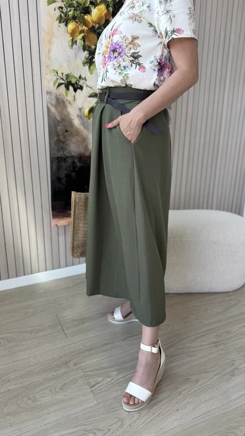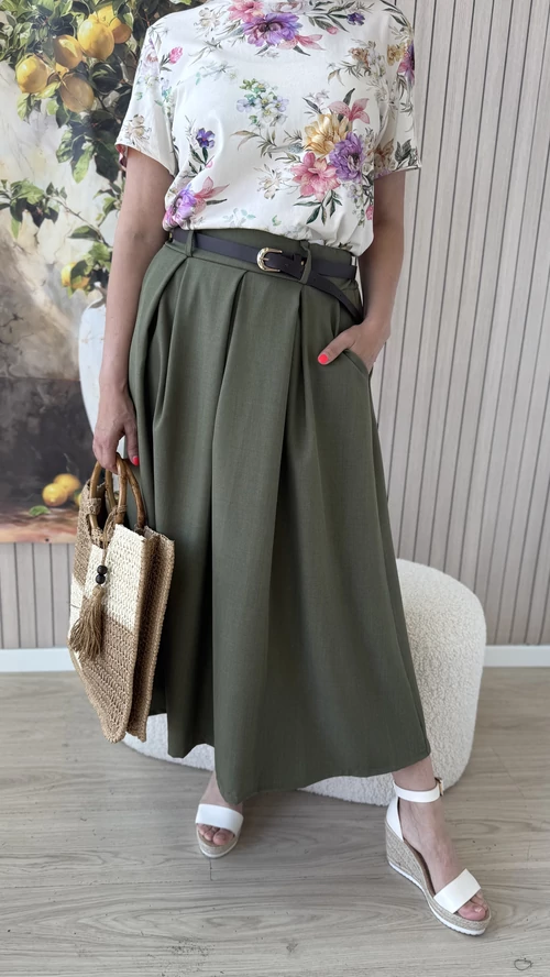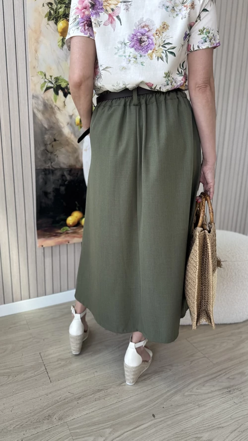 Lenge maxi szoknya zsebekkel és saját övvel, amely kényelmes gumis derékrésszel rendelkezik. Ez a szoknya könnyed, légies anyagból készült, így ideális választás a melegebb napokra. Praktikus zsebei és stílusos öve összhangban vannak a trendi megjelenéssel, miközben a gumis derék tökéletes illeszkedést biztosít mindenféle testalkathoz. Könnyen kombinálható különféle felsőkkel és lábbelikkel, így sokoldalúan alkalmazható mindennapi viseletre vagy alkalmi eseményekre.