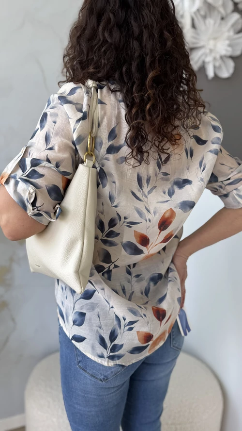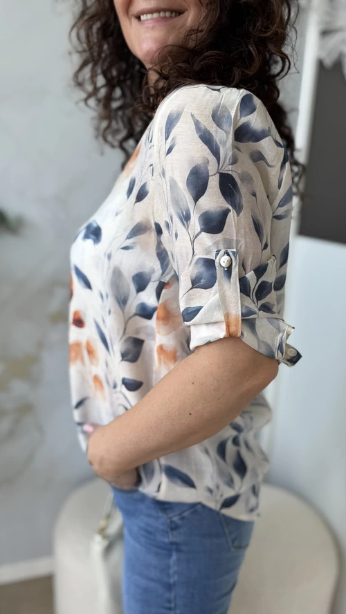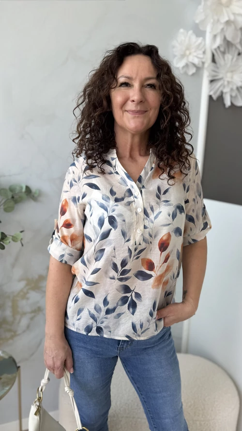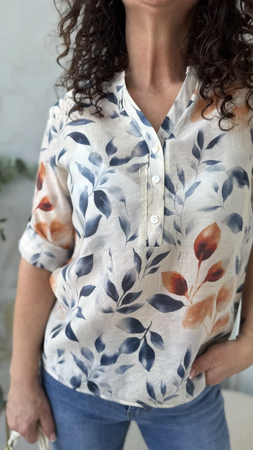 Ez a könnyed, tavaszi viseletre tervezett blúz világos alapon levélmintákkal díszített, amelyek friss és természetes megjelenést kölcsönöznek. Kényelmes V nyak kivágással és 3/4-es ujjal rendelkezik, így ideális választás a melegebb napokra. Anyaga légies, garantálja a komfortos érzést egész napra. Tökéletes darab különleges alkalmakra vagy hétköznapi viselethez.