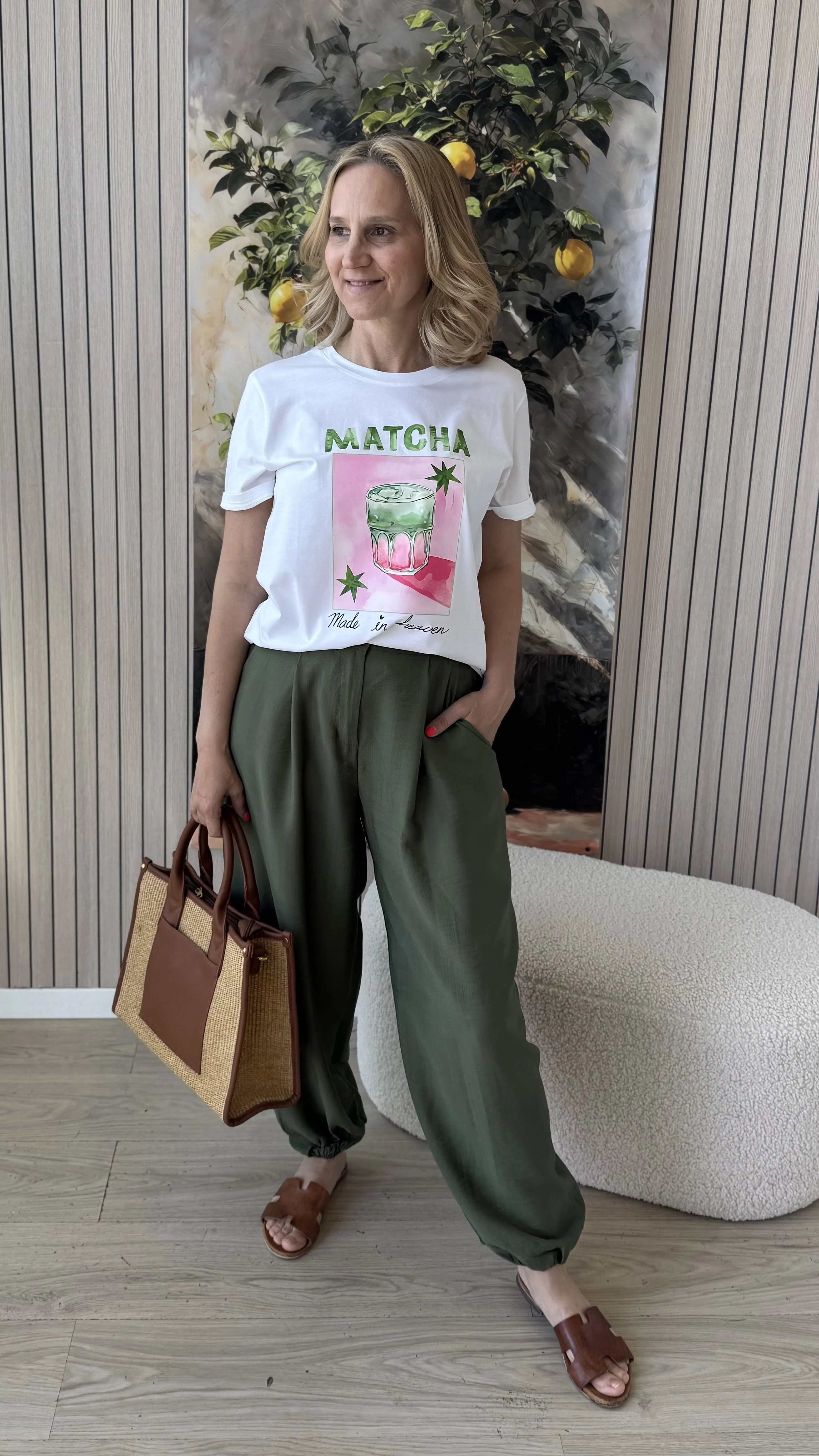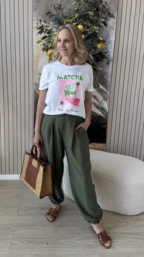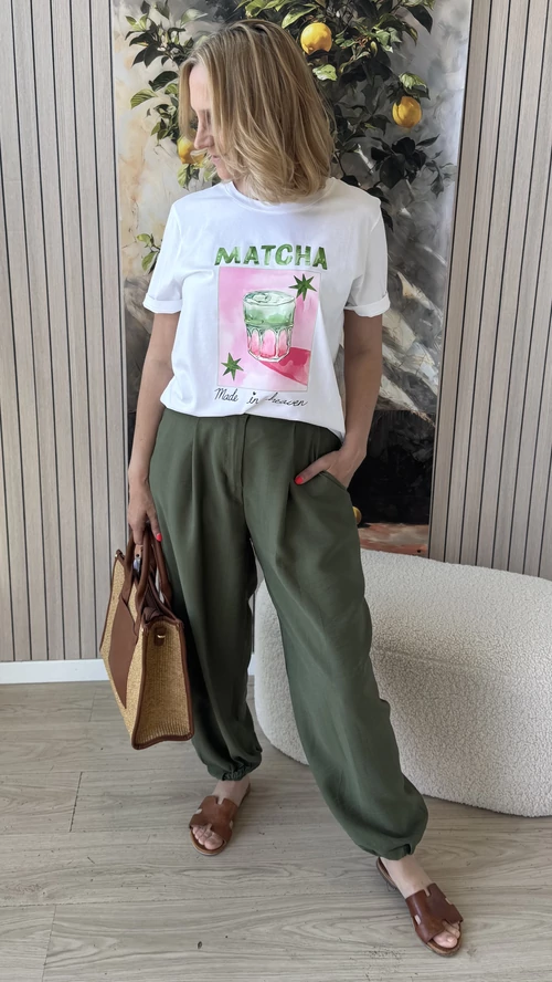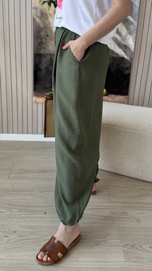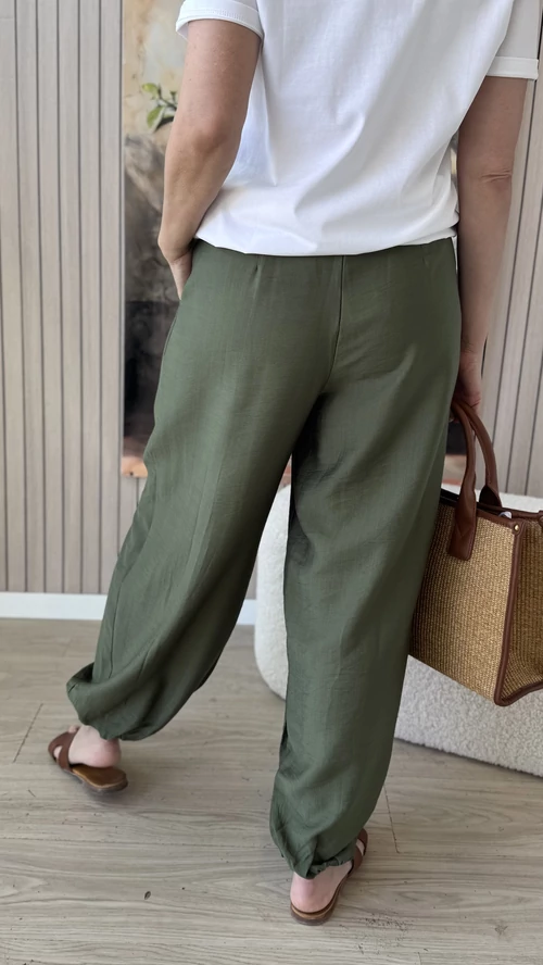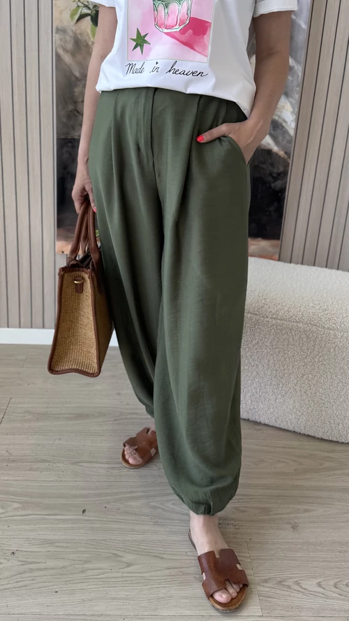 Ez a kényelmes, bővebb fazonú nadrág tökéletes választás a mindennapi viselethez. Gumis derekának köszönhetően könnyedén a testedhez igazodik, így egész nap komfortosan érezheted magad benne. A bokánál gumis alja nemcsak divatos megjelenést biztosít, hanem megkönnyíti a nadrág összehúzását is, így különleges, bővebb szabásával egyedi stílust kölcsönöz. A kellemes, lenge anyag nem feszül, így szabadon mozoghatsz benne. Praktikus zsebei lehetővé teszik a kisebb tárgyak kényelmes tárolását. Ideális választás könnyed, laza megjelenéshez és kényelemhez egyaránt.