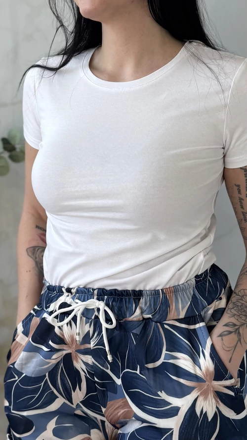 Ez a kerek nyakú póló egy egyszerű, letisztult stílusú basic darab, amely minden ruhatár alapvető eleme lehet. Fehér színe miatt könnyen kombinálható különböző öltözékekkel, így rendkívül sokoldalúan kihasználható. Rövid ujjú kialakításának köszönhetően kellemes viselet a melegebb napokon is. Kerek nyakú szabásával klasszikus és időtálló megjelenést biztosít. Ideális választás mindennapi használatra, legyen szó hétköznapi vagy alkalmi alkalmakról.