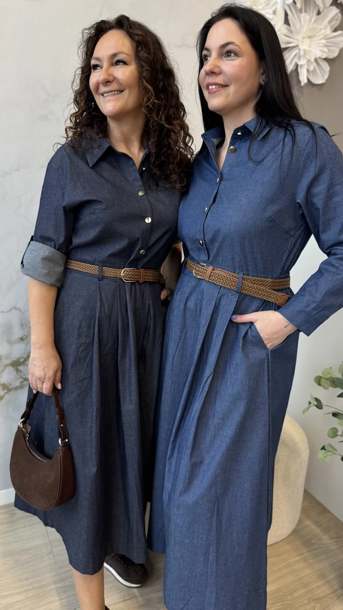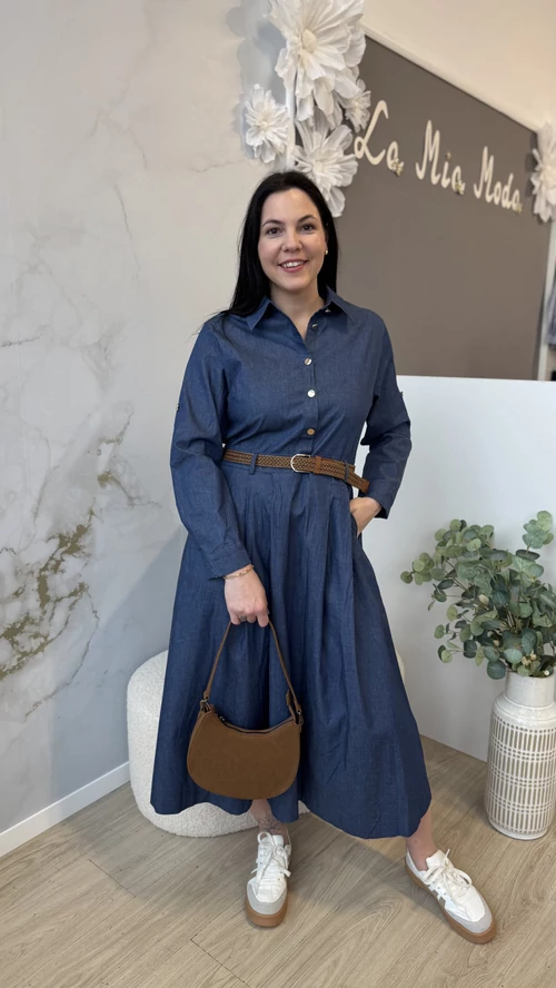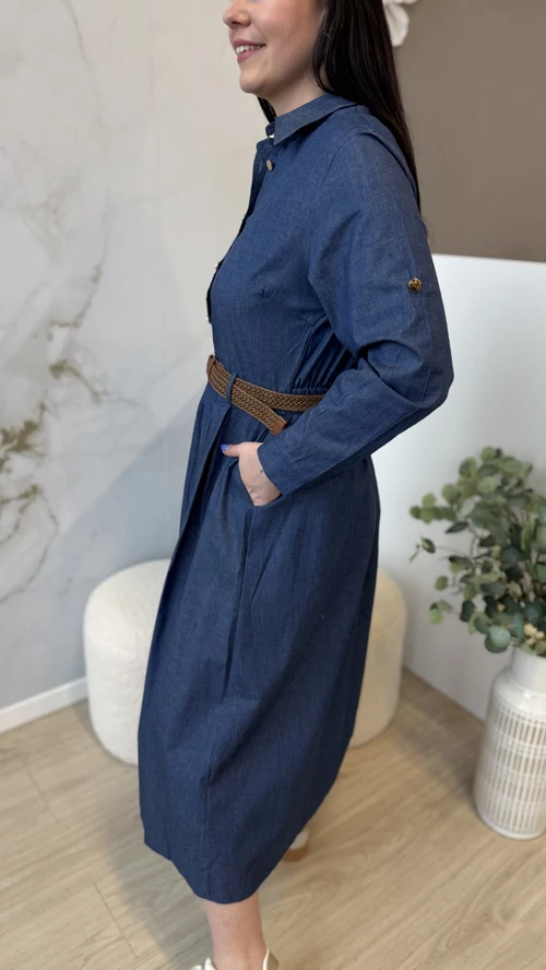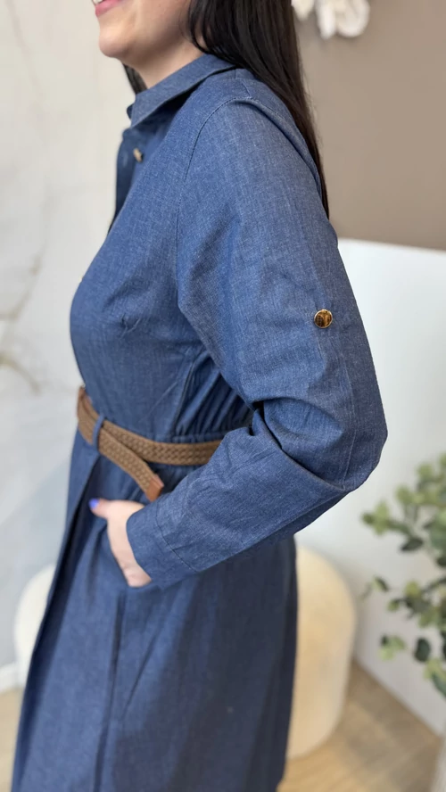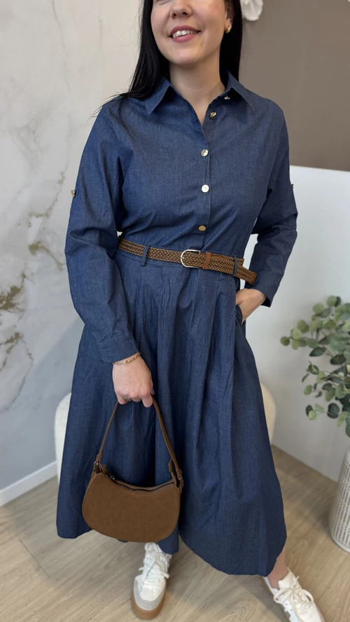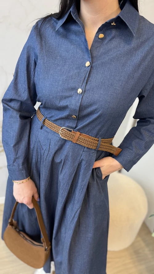 Ez a világoskék midi ruha ideális választás azok számára, akik a hétköznapokban is szeretnének stílusosak és kényelmesek maradni. A ruha saját fonott barna övvel rendelkezik, amely tökéletesen kiemeli a derékvonalat és különleges, egyedi megjelenést kölcsönöz. Kellemes anyagának és szabásának köszönhetően egész nap könnyed viseletet biztosít. Viseld irodába, városi sétákhoz vagy baráti találkozókra, ez a darab garantáltan feldobja a ruhatáradat.