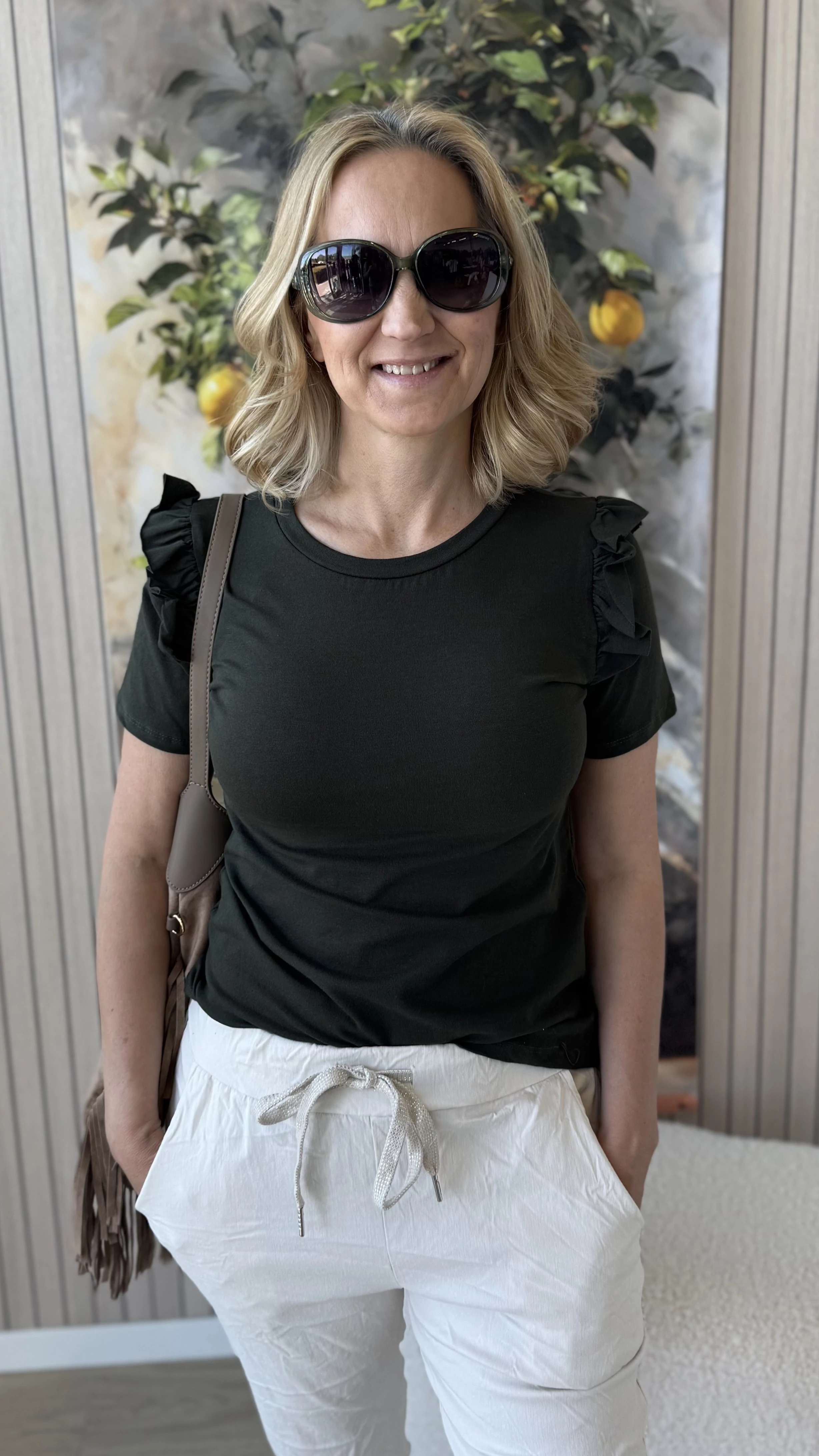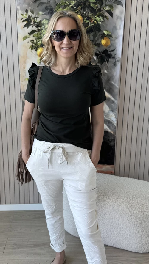 Elegáns és nőies megjelenést kínál ez a kicsit passzosabb fazonú, keki színű felső, amely tökéletesen követi az alak vonalait. A vállrésznél található apró fodrok különleges díszítő elemként emelik ki a darabot, így egyedi és stílusos megjelenést biztosítanak. Kényelmes viselet mindennapokra, amely könnyedén kombinálható különféle ruházati darabokkal. Ideális választás azoknak, akik kedvelik a finoman részletezett, mégis visszafogott ruhákat.