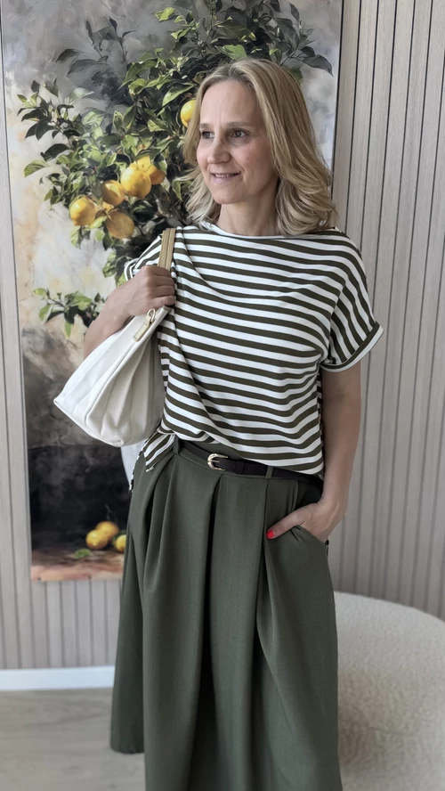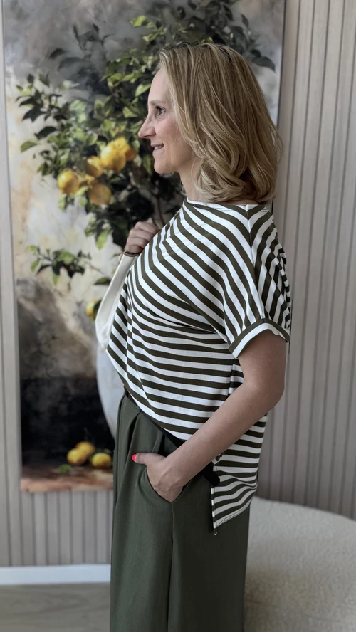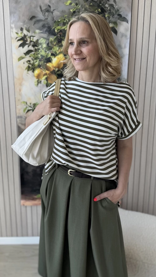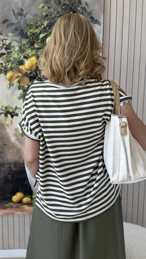 Ez a csíkos felső kényelmes, bővebb fazonú, amely tökéletes választás a laza, mindennapi megjelenéshez. A csónak nyakkivágás elegáns, nőies hatást kölcsönöz a darabnak. A rövid ujjú felső kellemes viselet a melegebb napokon is. Keki alapszínű, finom fehér csíkokkal díszített, így könnyen kombinálható különböző ruhadarabokkal. Ideális választás azok számára, akik kedvelik az egyszerű, mégis stílusos megjelenést.
