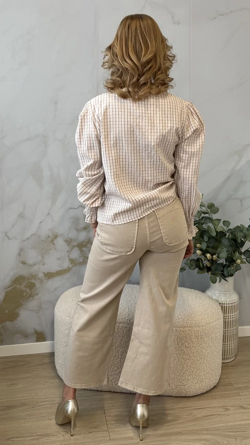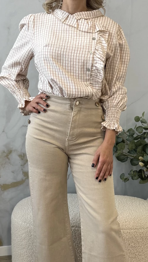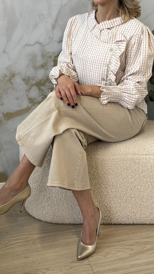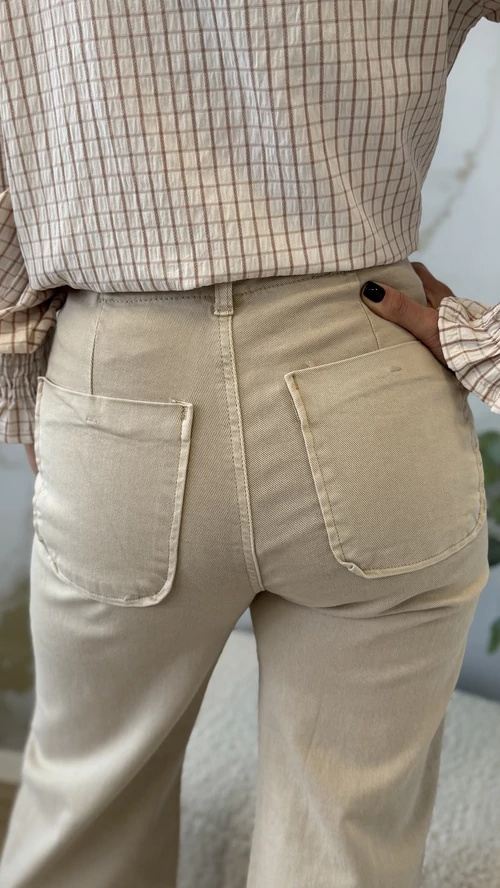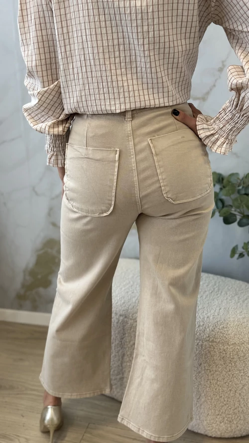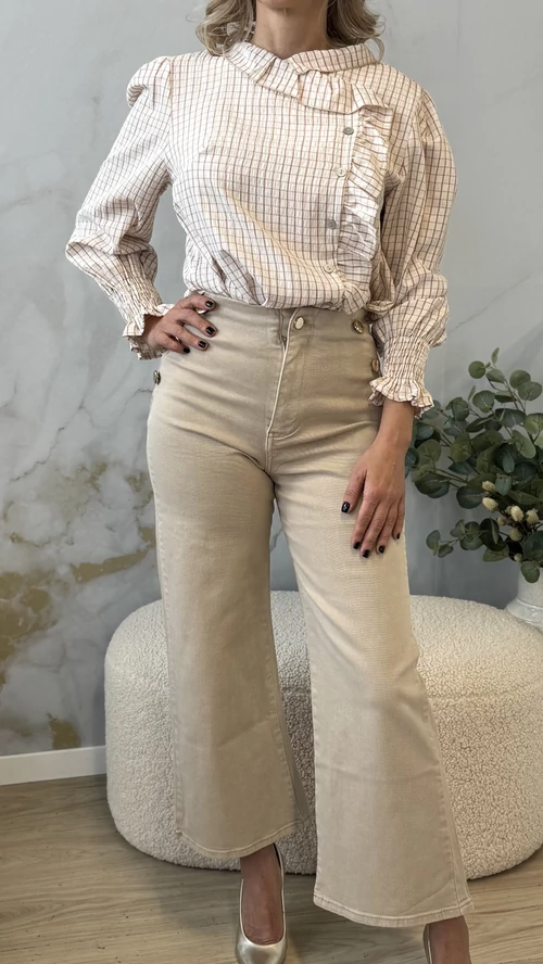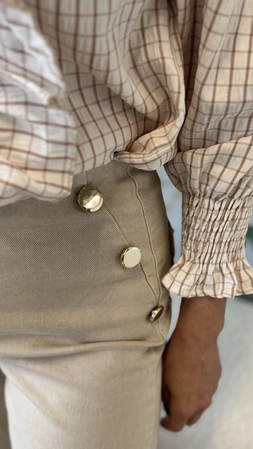 Rövid szárú, trapéz fazonú, sztreccses anyagú, bézs színű farmerünk kiváló minőségű, tartós anyagból készült, amely biztosítja a hosszú élettartamot és a kényelmes mozgást egész nap. A bézs szín letisztult és univerzális, könnyen kombinálható különféle felsőkkel és cipőkkel. Klasszikus farmer fazonja, arany gombos díszítése és rövid szára divatos megjelenést kölcsönöz viselőjének. Legyen szó hétköznapi viseletről vagy laza alkalmi programról, ez a farmer tökéletes választás.