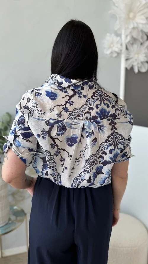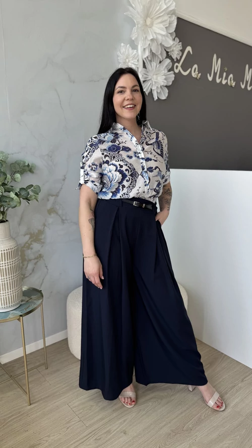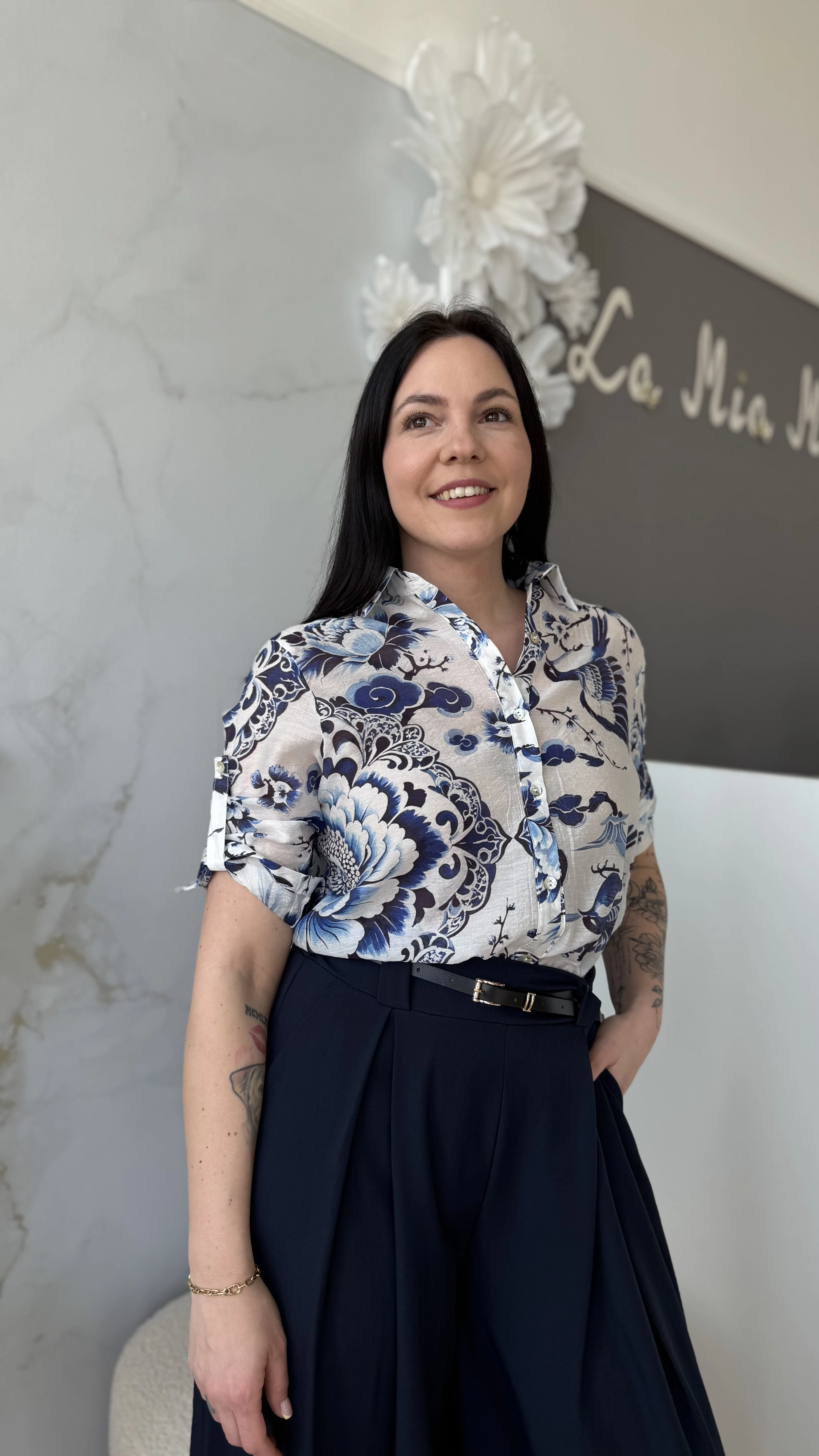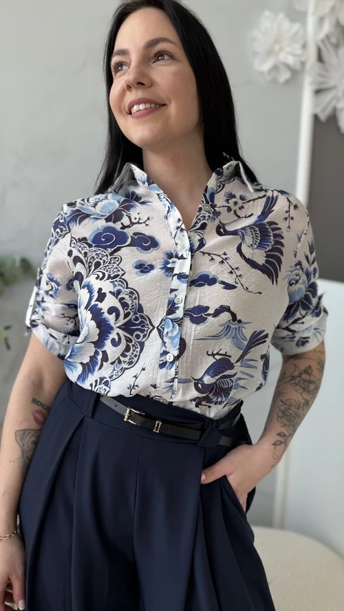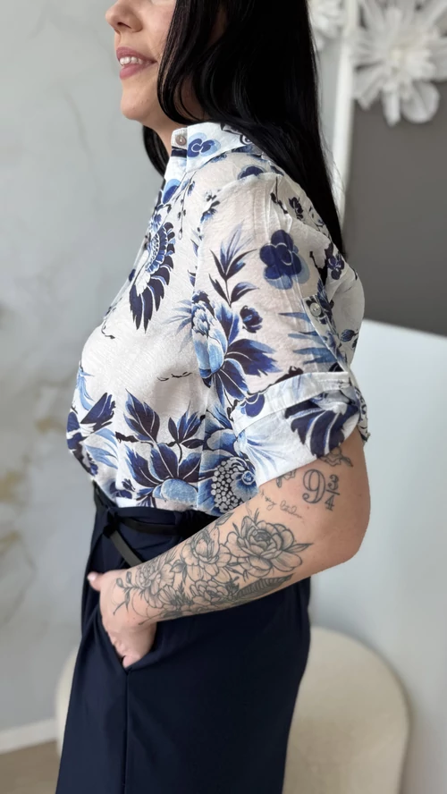Ez a lenge, gombos galléros SweetM felső tökéletes választás tavaszi és nyári viselethez. Fehér alapon kék mintákkal díszített, melyek friss, vidám hangulatot kölcsönöznek. 3/4-es ujjai felgombolhatóak, így könnyedén alkalmazkodik az időjáráshoz és stílusodhoz. Ez a felső remekül kombinálható más ruhadarabokkal, alapdarabként szolgálhat a szettedben, és feldobja megjelenésedet. Kényelmes, légies anyaga révén hosszú órákon át komfortos viseletet biztosít.