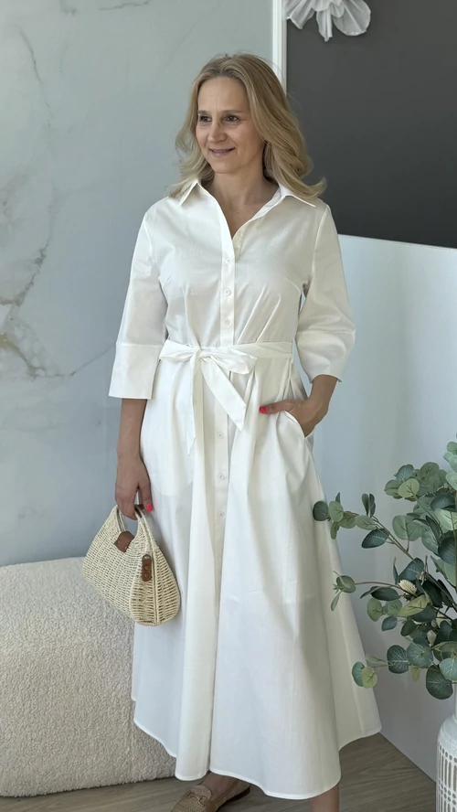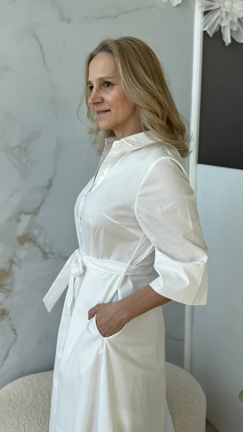 Stílusos és kényelmes választás a mindennapokra! Ez a női ruha fehér színben elérhető, amely feldobja megjelenésedet, legyen szó akár egy hétköznapi sétáról vagy különleges alkalomról. Puha, légáteresztő, pamutvászon, enyhén elasztikus anyagból készült, így egész nap kellemes viseletet biztosít. A szabása modern és nőies, kiemeli az alakot, miközben elegendő mozgásteret nyújt. Egyszerűen kombinálható különböző kiegészítőkkel, tökéletes darab a ruhatáradban. Válaszd ezt a ruhát, ha stílusos megjelenésre és kényelmes viseletre vágysz!