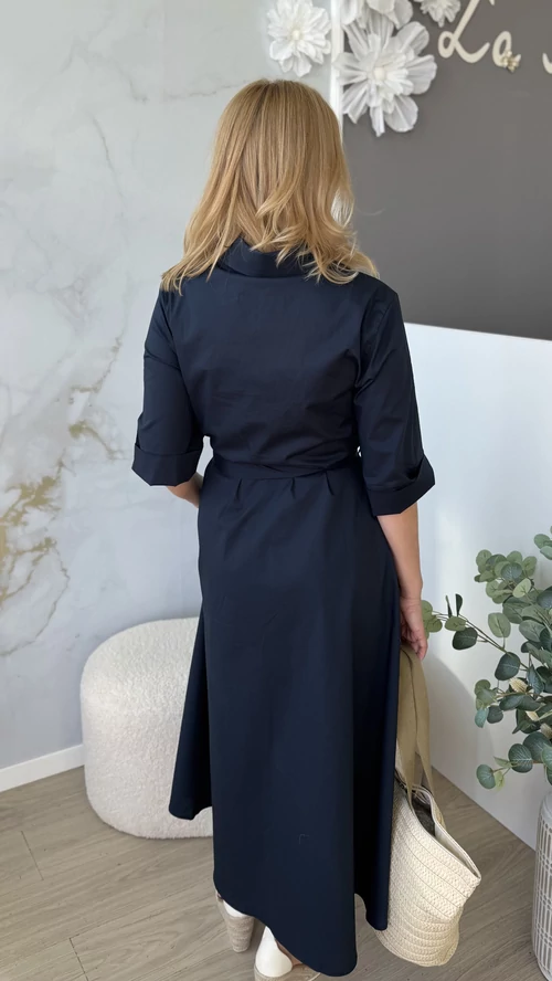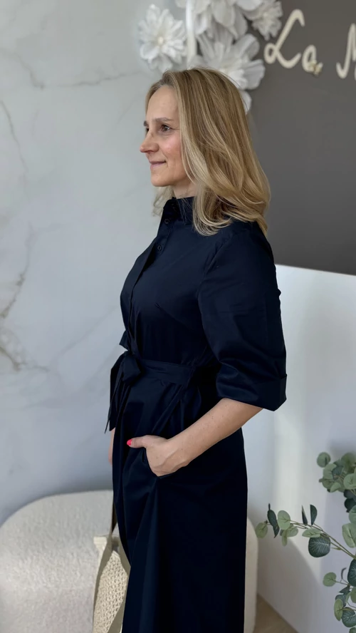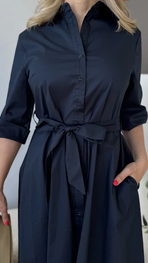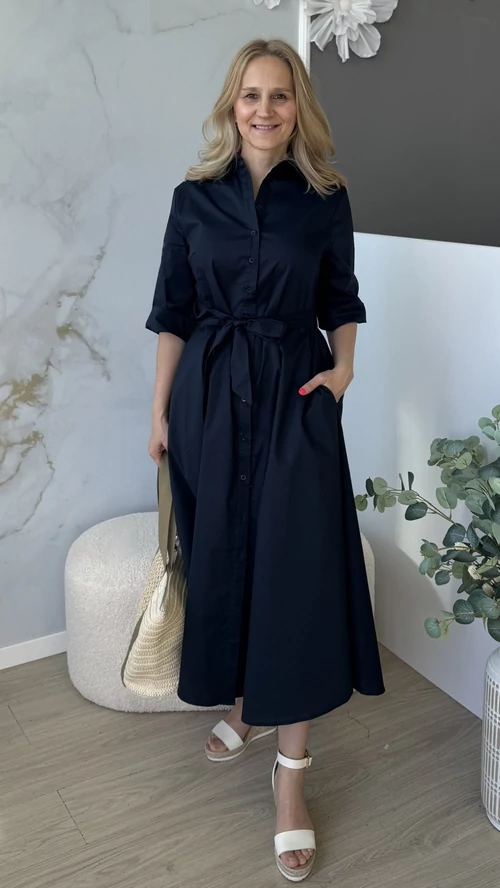 Stílusos és kényelmes választás a mindennapokra! Ez a női ruha sötétkék színben elérhető, amely feldobja megjelenésedet, legyen szó akár egy hétköznapi sétáról vagy különleges alkalomról. Puha, légáteresztő, pamutvászon, enyhén elasztikus anyagból készült, így egész nap kellemes viseletet biztosít. A szabása modern és nőies, kiemeli az alakot, miközben elegendő mozgásteret nyújt. Egyszerűen kombinálható különböző kiegészítőkkel, tökéletes darab a ruhatáradban. Válaszd ezt a ruhát, ha stílusos megjelenésre és kényelmes viseletre vágysz!
