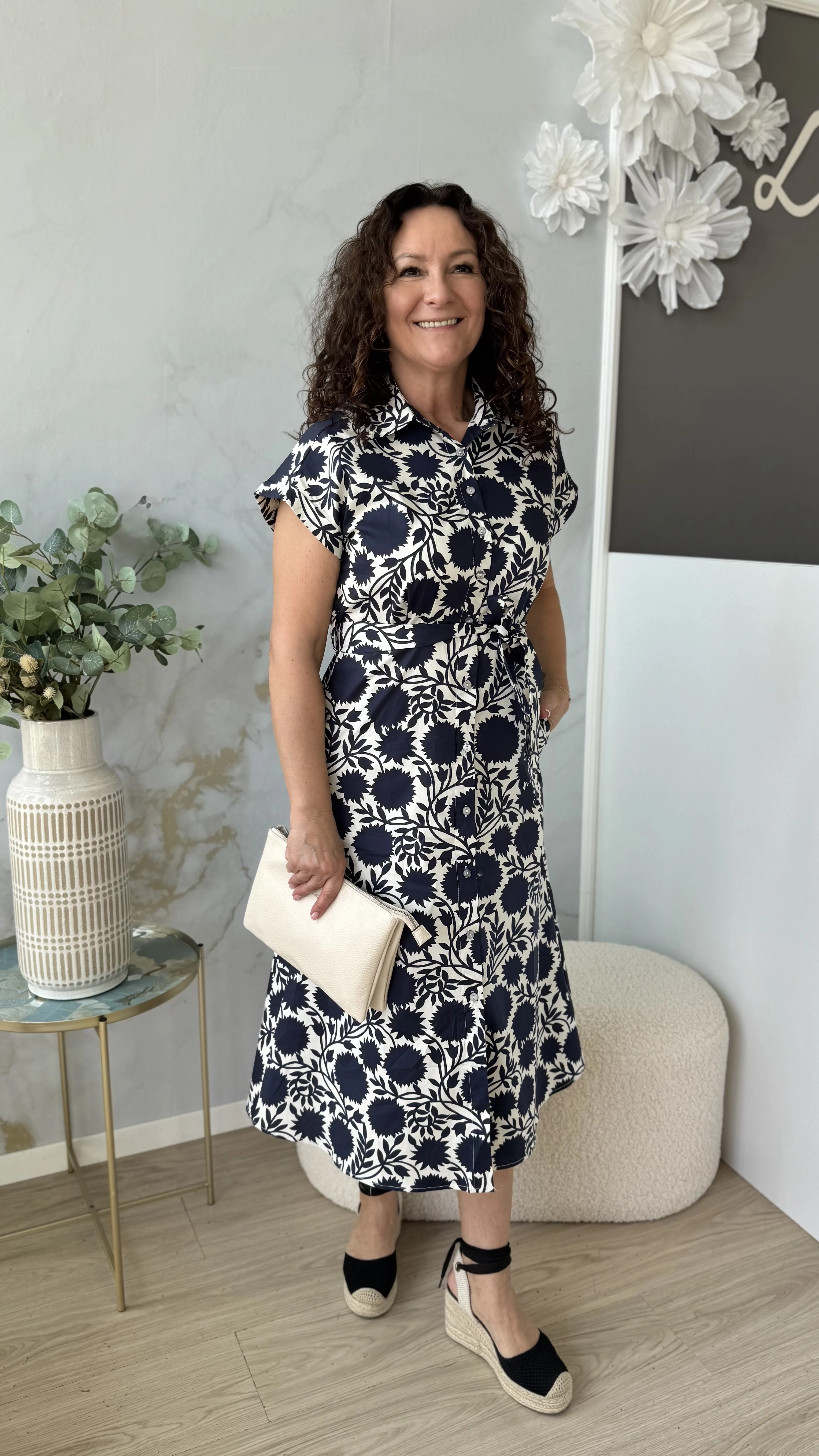 Ez a ruha egy elegáns és stílusos választás a tavaszi és nyári napokra. A ruha fehér alapon sötétkék mintákkal díszített, amely friss és vidám megjelenést kölcsönöz viselőjének. Galléros kialakítása és gombos elemei klasszikus, mégis modern hatást biztosítanak. A derék részen megköthető megoldás kiemeli az alakot és nőies vonalakat hangsúlyoz. Midi hosszúsága tökéletes választás a melegebb évszakokra, kényelmes viseletet és eleganciát egyaránt garantál. Ideális választás mindennapi használatra vagy különleges alkalmakra.