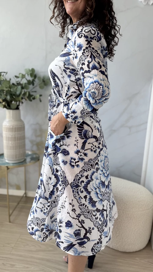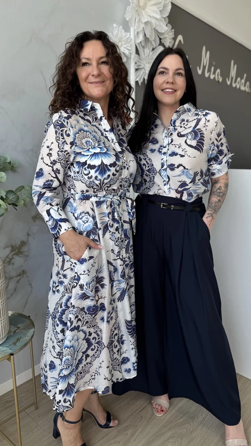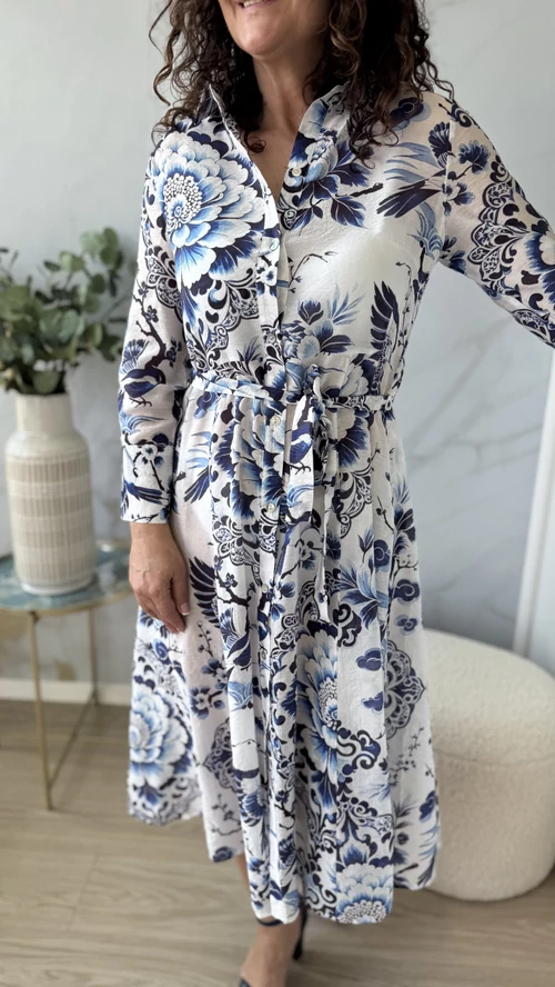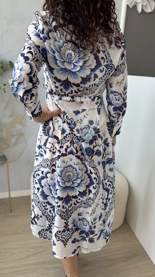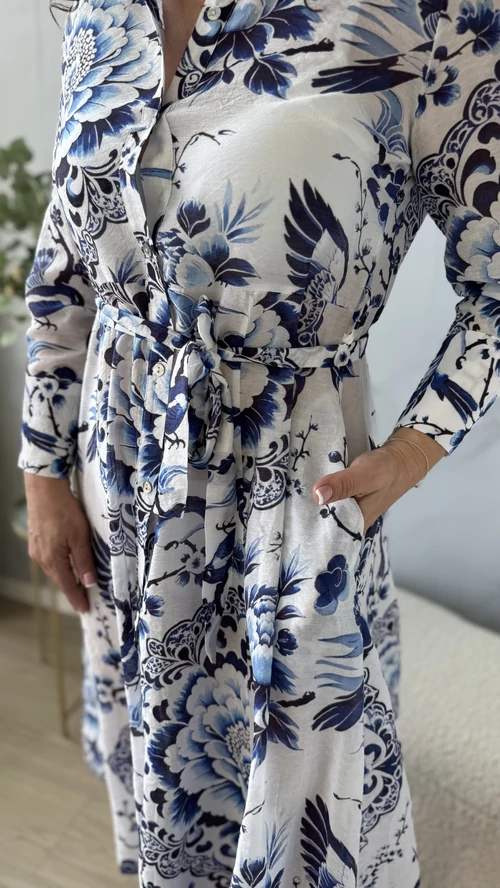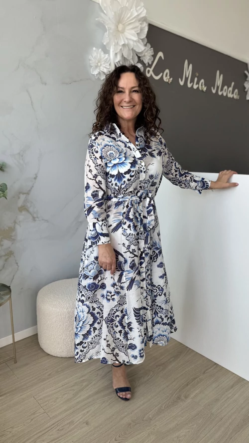 Ez a SweetM női ruha tökéletes választás a tavaszi és nyári napokra. Fehér alapon kék mintákkal díszített, mely vidám és egyedi megjelenést kölcsönöz viselőjének. A ruha gombos kialakítású, amely praktikus és stílusos egyben. A derékrésznél saját övvel szabható testre, így kiemeli az alakot és kényelmes viseletet biztosít. Galléros, hosszú ujjú fazonja légiesen könnyű, vékony anyagból készült, így ideális választás a melegebb időszakokra. Válaszd a SweetM női ruhát, ha egy könnyed, elegáns és színpompás ruhadarabra van szükséged!