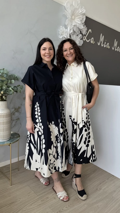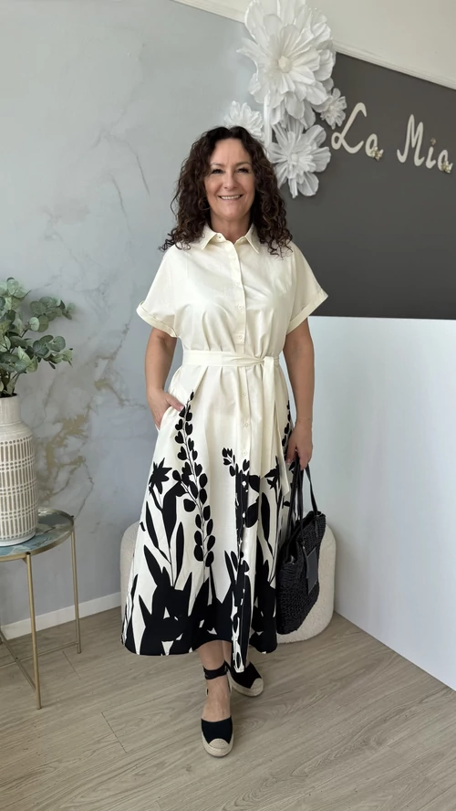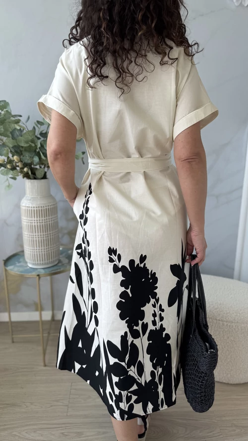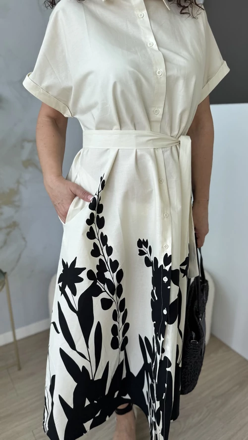 Ez a rövid ujjú, galléros SweetM női ruha fehér alapszínű, melyet elegáns, fekete minták díszítenek, így modern és friss megjelenést kölcsönöz a viseletnek. A ruha kényelmes és praktikus kialakítású, ideális mindennapi használatra vagy különleges alkalmakra. A derékrésznél található saját öv gondoskodik arról, hogy a szabás szépen kiemelje az alakot, és még divatosabbá tegye a ruhát. Légies anyagának köszönhetően könnyed mozgást biztosít egész nap. Válaszd ezt a SweetM ruhát, ha egy stílusos, elegáns és kényelmes darabot keresel gardróbodba!