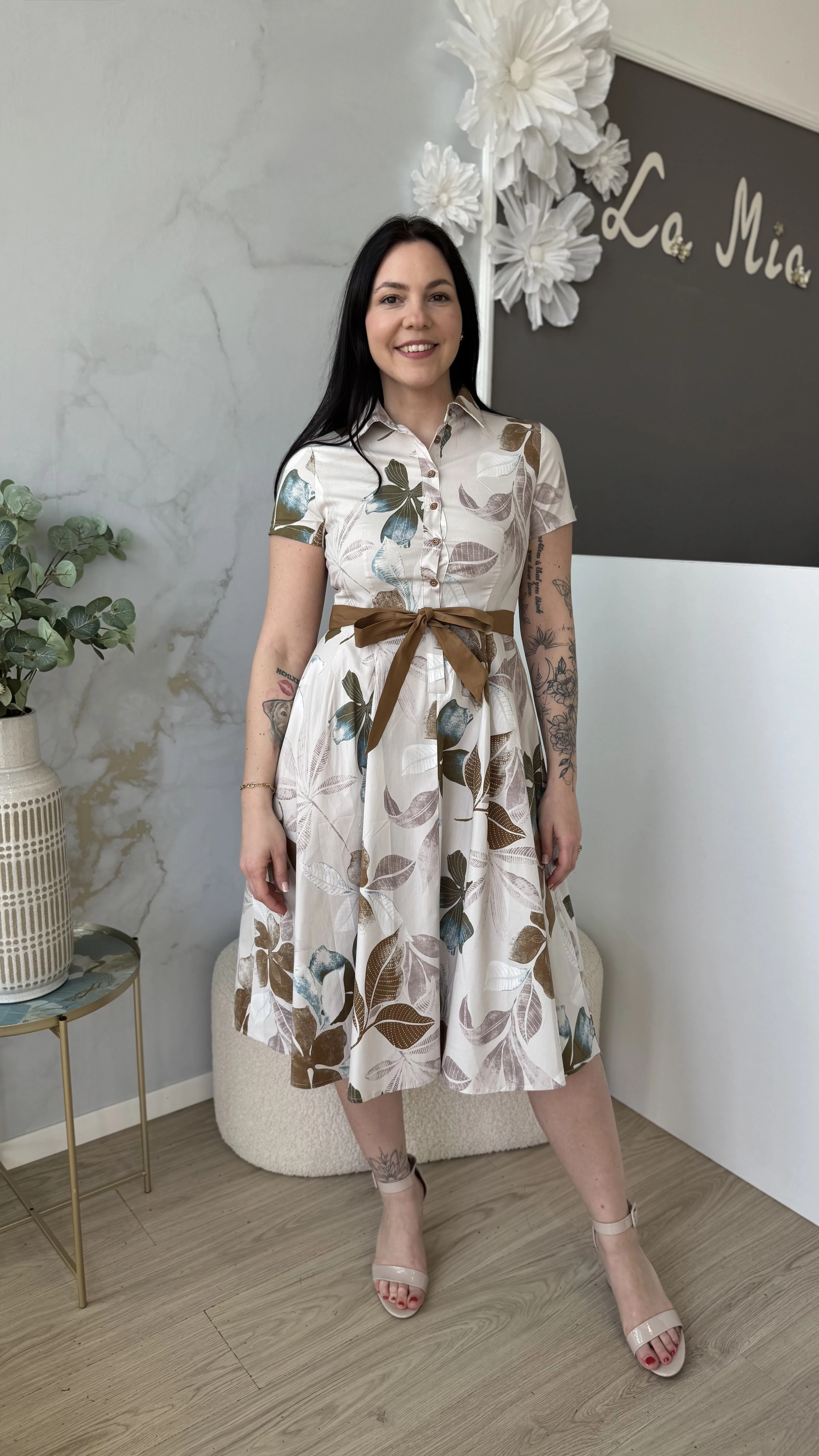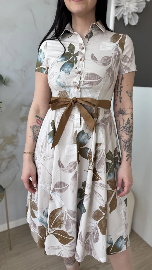 Ez a SweetM női ruha egyszerre stílusos és kényelmes viselet. Kialakítása kiemeli a derékrészt, ahol saját övvel rendelkezik, így még hangsúlyosabbá teszi az alakot. Galléros, rövid ujjú fazonja elegáns megjelenést biztosít, miközben a puha pamut anyag lélegző és kellemes tapintású, ideális a mindennapi viselethez. Tökéletes választás azoknak, akik divatos és komfortos ruhadarabot keresnek.