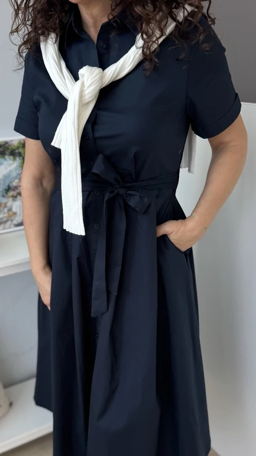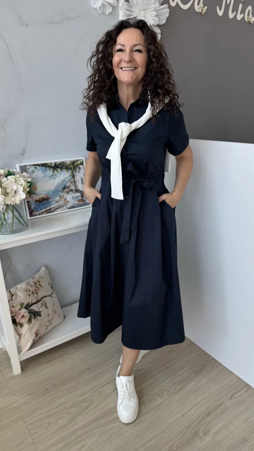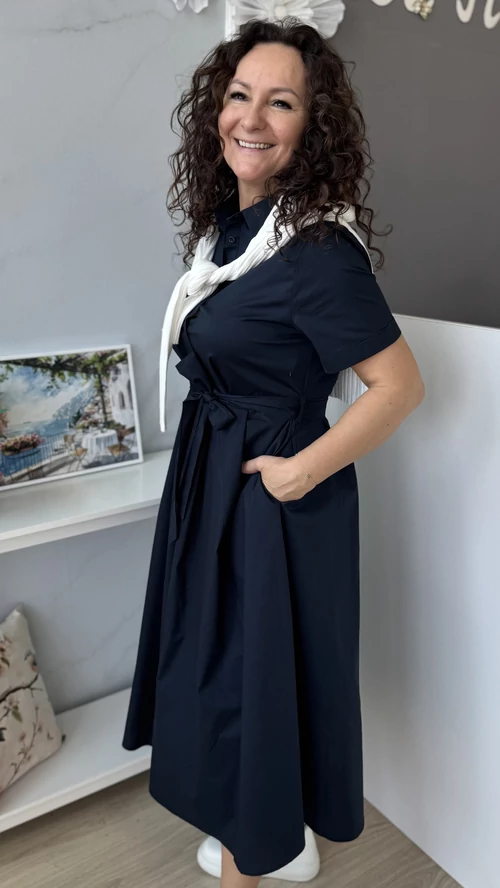 Stílusos és kényelmes választás a mindennapokra! Ez a női ruha sötétkék színben elérhető, amely feldobja megjelenésedet, legyen szó akár egy hétköznapi sétáról vagy különleges alkalomról. Puha, légáteresztő, pamutvászon, enyhén elasztikus anyagból készült, így egész nap kellemes viseletet biztosít. A szabása modern és nőies, kiemeli az alakot, miközben elegendő mozgásteret nyújt. Egyszerűen kombinálható különböző kiegészítőkkel, tökéletes darab a ruhatáradban. Válaszd ezt a ruhát, ha stílusos megjelenésre és kényelmes viseletre vágysz!