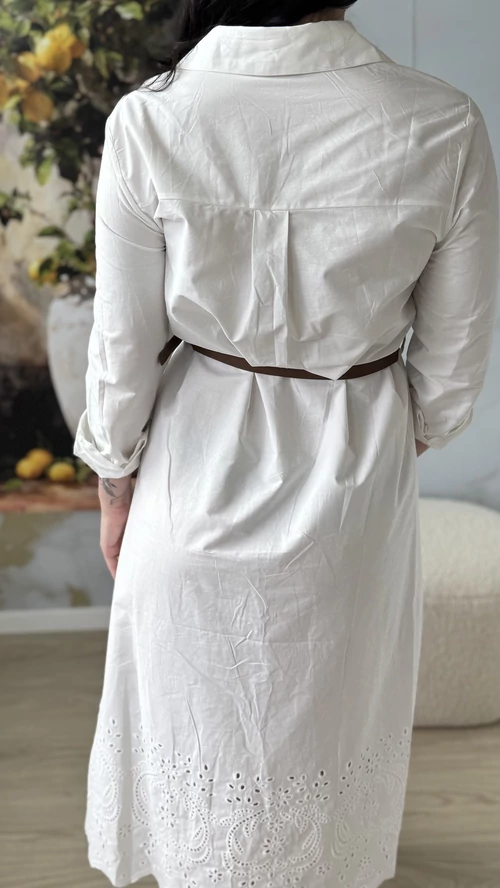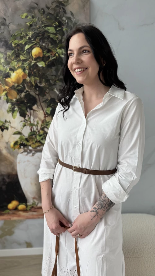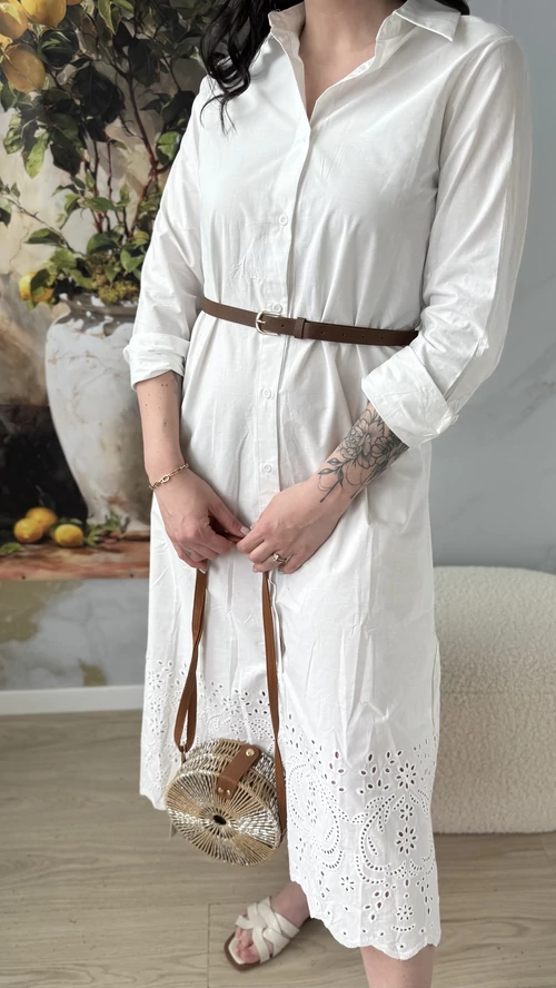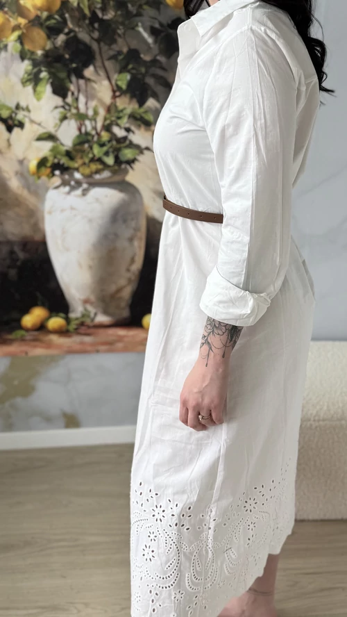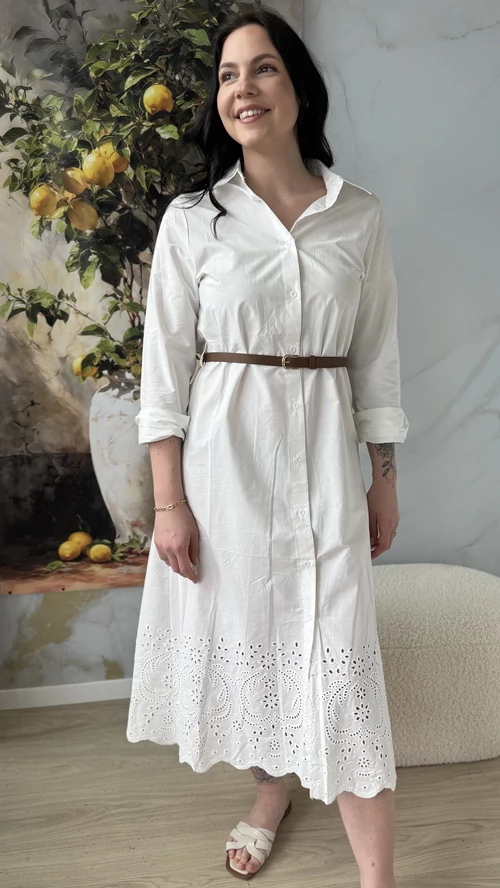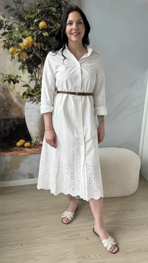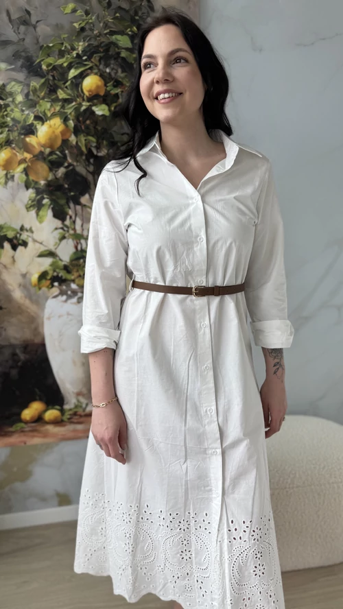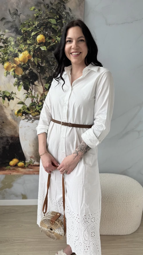 A SweetM női ruha madeira hímzéssel egy igazán különleges darab lesz a ruhatáradban. Ez a fehér ruha finom, alján madeira hímzéssel díszített, amely eleganciát és nőiességet kölcsönöz neki. Kényelmes, könnyű, 100% pamutvászon anyagból készült, így tökéletes választás a melegebb napokra vagy különleges alkalmakra. A ruha szabása jól követi a test vonalait, kiemelve a formákat, miközben szabad mozgást biztosít. Ha szereted az egyedi, különleges ruhákat, biztosan elnyeri a tetszésedet.