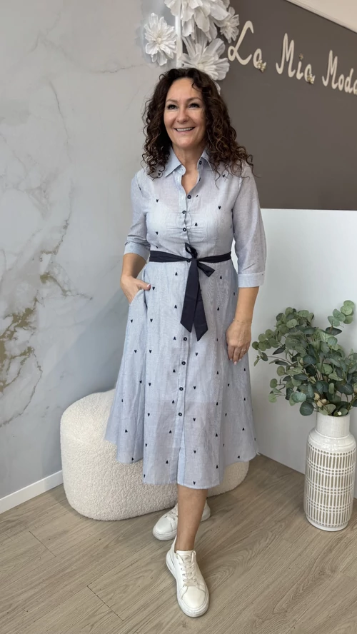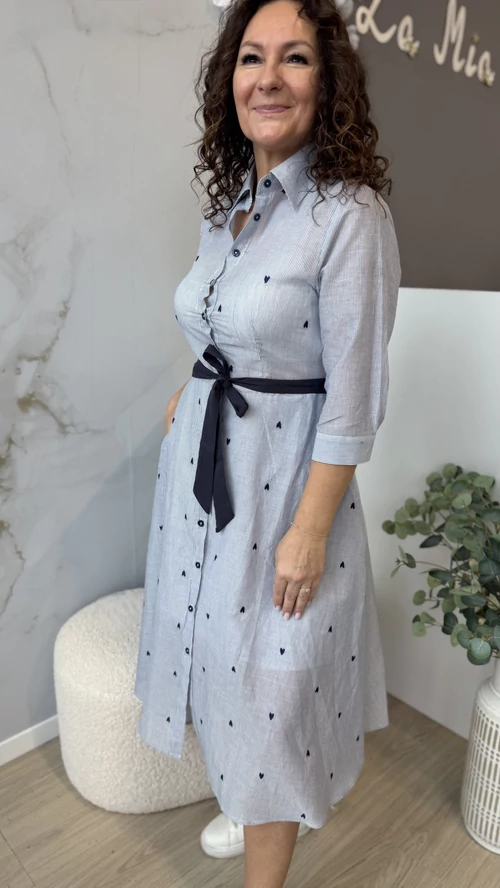 Ez a kék csíkos ing ruha tökéletes választás a tavaszi szezonra. Kényelmes viseletet biztosít a puha anyagának köszönhetően, amely egész nap komfortos érzést nyújt. A szivecskés mintázat játékos, mégis stílusos megjelenést kölcsönöz a ruhának. Könnyen kombinálható különböző kiegészítőkkel, így sokféleképpen kihasználható a ruhatárban. Ideális választás mindennapi használatra, amikor egy könnyed, mégis trendi outfitet szeretnél.
