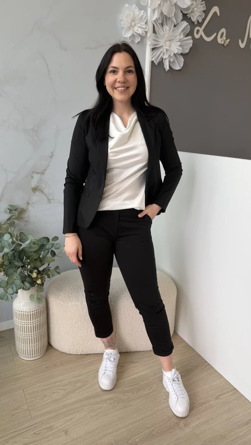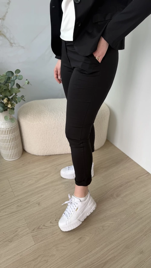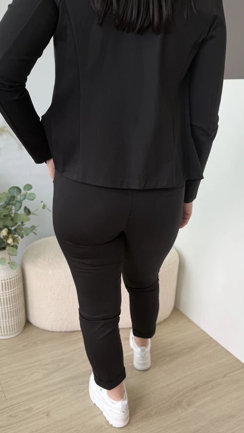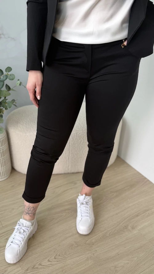 Ez a 7/8-os hosszúságú nadrág tökéletes választás, ha egyszerre szeretnél elegáns és sportos stílust viselni. Rugalmas anyagának köszönhetően kényelmesen illeszkedik a testhez, kiemelve az alakot. Elől gombos megoldása különleges eleganciát kölcsönöz, miközben a szűk fazon megőrzi a nadrág modern, divatos megjelenését. Ideális viselet munkahelyre, hétköznapi eseményekre vagy akár elegáns alkalmakra is.