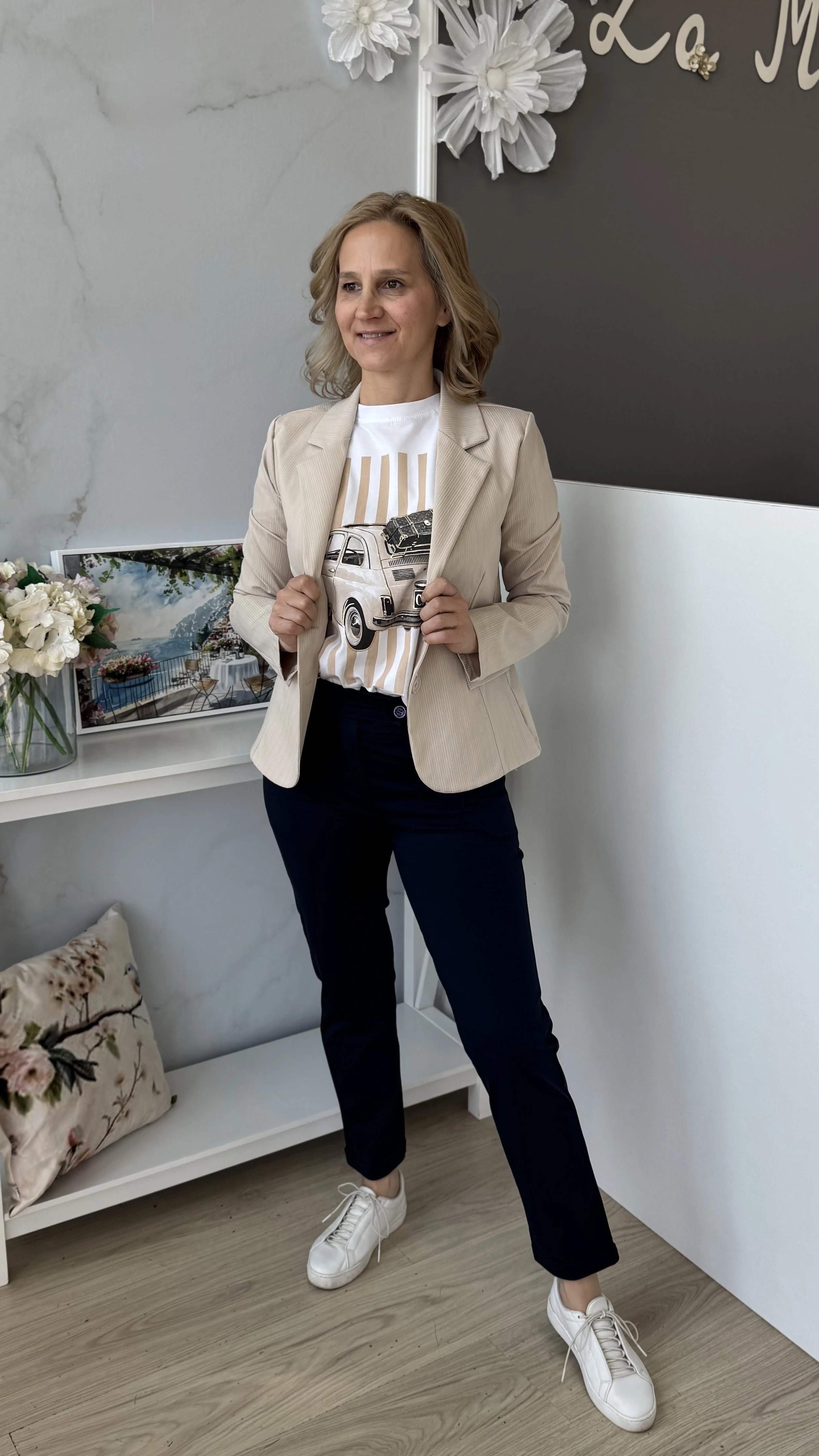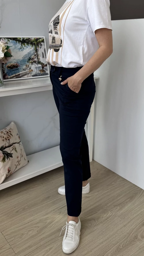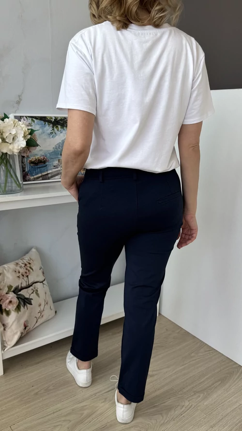 Ez a 7/8-os hosszúságú nadrág tökéletes választás, ha egyszerre szeretnél elegáns és sportos stílust viselni. Rugalmas anyagának köszönhetően kényelmesen illeszkedik a testhez, kiemelve az alakot. Elől gombos megoldása különleges eleganciát kölcsönöz, miközben a szűk fazon megőrzi a nadrág modern, divatos megjelenését. Ideális viselet munkahelyre, hétköznapi eseményekre vagy akár elegáns alkalmakra is.